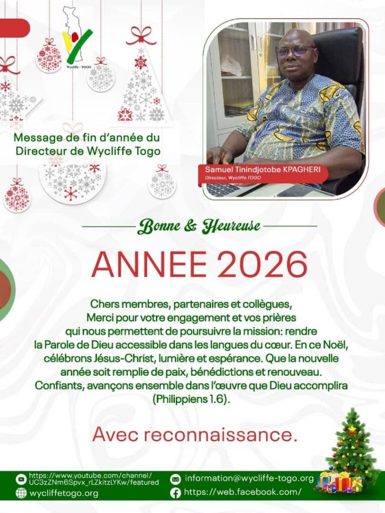 Au terme de cette année, je tiens à vous exprimer, au nom de Wycliffe Togo, notre profonde gratitude pour votre engagement et votre soutien. Grâce à votre collaboration, vos prières et vos efforts, nous avons pu poursuivre avec détermination la mission qui nous unit : rendre la Parole de Dieu accessible dans les langues du cœur des communautés.